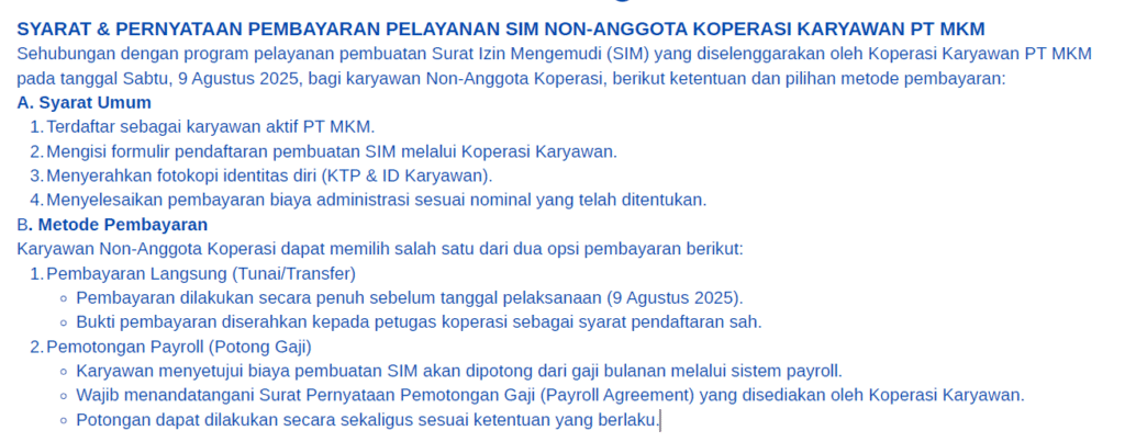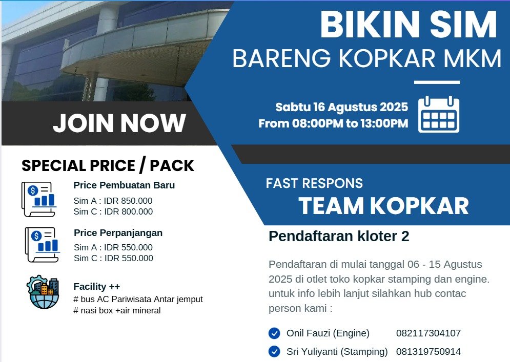 Sebagai bagian dari program pelayanan Koperasi Karyawan PT MKM, pembuatan SIM kolektif akan dilaksanakan pada: